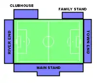 The stadium is known for its unusual location, being set into the side of a hill. It has two seated stands and two covered terraces. The Main Stand, which has been in place since 1951, occupies the length of one side of the pitch and has a roof supported by numerous columns, which obscure the view for some fans. Identical covered terraces for standing spectators are behind both goals, which also suffer from an obstructed view. The small Family Stand occupies a portion of the side opposite the Main Stand. The remainder of this side of the ground is taken up by the clubhouse, toilets and other club facilities. Unlike most football stadiums, the club directors' lounge is set atop one of the stands.[8] In December 2009 the Football Association gave the stadium's facilities an A grade, meaning that it meets the minimum standard for entry to the Football League.[19]