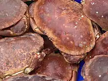 Several species of wild crab are the subject of crab fisheries around the coasts of the British Isles. The most important are the brown crab or edible crab, Cancer pagurus (29,193 t), various swimming crabs (3,180 t), the spider crab Maja brachydactyla (1,565 t), the shore crab or green crab Carcinus maenas (553 t) and the velvet crab Necora puber (193 t). Around 77% of the catch is landed in the United Kingdom, 19% in Ireland, 4% in the Channel Islands, and 1% in the Isle of Man.[Note 2]