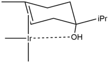 The hydrogenation of a terpen-4-ol demonstrates the ability of compounds with directing groups (the –OH group) to undergo diastereoselective hydrogenation. With palladium on carbon in ethanol the product distribution is 20:80 favoring the cis isomer (2B in Scheme 1). The polar side (with the hydroxyl group) interacts with the solvent. This is due to slight haptophilicity, an effect in which a functional group binds to the surface of a heterogeneous catalyst and directs the reaction.[11][12] In cyclohexane as solvent, the distribution changes to 53:47 because haptophilicity is no long present (there is no directing group on cyclohexane). The distribution changes completely in favor of the trans isomer 2A when Crabtree's catalyst is used in dichloromethane. This selectivity is both predictable and practically useful.[13] Carbonyl groups are also known to direct the hydrogenation by the Crabtree catalyst to be highly regioselective.[14][15][16]
