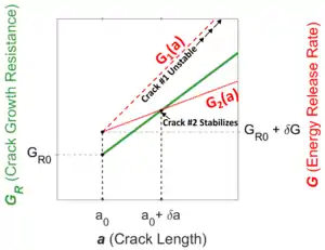 Conceptually can be thought of as the energetic gain associated with an additional infinitesimal increment of crack extension, while can be thought of as the energetic penalty of an additional infinitesimal increment of crack extension. At any moment in time, if then crack extension is energetically favorable. A complication to this process is that in some materials, is not a constant value during the crack extension process.[1] A plot of crack growth resistance versus crack extension is called a crack growth resistance curve, or R-curve. A plot of energy release rate versus crack extension for a particular loading configuration is called the driving force curve. The nature of the applied driving force curve relative to the material's R-curve determines the stability of a given crack.