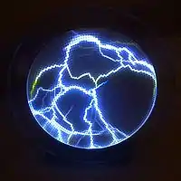A crackle tube is a type of plasma lamp that is used most commonly in museums, night clubs, movie sets, and other applications where its appearance may be appealing for entertainment. Such a device consists of a double walled glass tube with a hollow center. The cavity between the inner and outer glass tubes is filled with thousands of small phosphor coated glass beads. A 5–14 kV transformer produces a low power gas discharge in the bead filled cavity, producing filaments of light that simulate lightning. Crackle tubes get their name not because of the sound they produce but rather because of the appearance of their internal behavior. The "lightning" (filaments or streamers) is forced around and in between the phosphor-coated glass beads, due to the beads' dielectric nature. In so doing, the phosphor is excited by the electrical energy and fluoresces producing visible light. Like plasma globes, crackle tubes respond to touch; the filaments appear to be "attracted" toward the point of contact and usually become more luminous (brighter) as the electricity is grounded. The tubes are also filled with a noble gas like neon, argon, or xenon which acts as the electron transfer medium of the cavity. The gas is typically below atmospheric pressure.