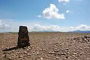 The summit bears an Ordnance Survey triangulation column, set on a stony plateau though it has recently collapsed. The view is excellent, although robbed of some foreground by the flat expanse of the top. All of the major fell groups can be seen with the Scafells particularly fine. Although a higher neighbour, Grasmoor detracts little from the view to the west.[3][4]