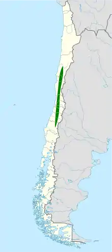 The crag chilia is endemic to central and north-central Chile between approximately 27° and 35° south latitudes. It is found primarily at elevations from 1,400 to 3,000 m (4,600 to 9,800 ft) but also at lower elevations in winter. Subspecies O. m. melanurus is found in the southern part of its range and O. m. atacamae is in the north.[5][4]