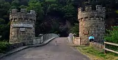 Craigellachie Bridge over the River Spey was built by Thomas Telford between 1812 and 1815.[1] A plaque on one of the castellated towers guarding the entrance to the bridge records that the metalwork was cast in Wales: another that the bridge was restored to this, something like its original condition, in 1964. The bridge is a remarkable piece of engineering, and can be viewed from above or below.