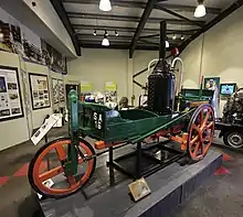 The Craigievar Express is a steam-powered tricycle built by Andrew 'Postie' Lawson between 1895 and 1897 in Craigievar, Scotland.[1] The vehicle's frame is made from wood, as are its wheels.[1][2] The engine is a single-cylinder model and was purchased second hand from a sawmill.[1] The Express's boiler was obtained through Exchange and Mart.[1] The flywheel brake acted on the engine, and following the principles of the horse-carriage braking system (brake shoes attached to a lever) another was applied to the rims of the back wheels.[1]