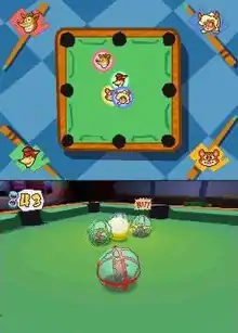 In the Adventure Mode, the characters compete in a race for the Super Big Power Crystal.[4] This race is made up of six stages, each containing smaller sub-maps. The host of the race, the Viscount, sets a task for each stage. This task must be completed before the player can continue to another map. The player with the most points is the winner of the stage.[4] The overall winner of all the stages is the winner of the Viscount's race.[4] In the Festival Mode, the gameplay is fundamentally the same as in the Adventure Mode, with the exception of the ability to select stages to play freely.[4] In the My Room mode, the player's character has his or her own private room in which the player can play minigames that have been collected in Adventure Mode, view a collection of items obtained in Adventure Mode, or create a Motion Panel, a unique in-game communication tool can allow customized messages to be sent mid-game to help friends or distract other players' gameplay.[4] The decorations in My Room are different for each character.[4]