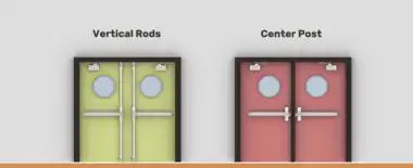 Center posts are an alternative to vertical rods at double door exits. This offers less clearance because the post remains in the middle when both doors are open. That said, the post can often be removed with a key for occasions when items larger than a single door need to pass through. Center posts may be preferred over vertical rods because they have fewer moving parts, thus they have fewer components that can break.