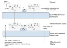 The creatine phosphate shuttle is an intracellular energy shuttle which facilitates transport of high energy phosphate from muscle cell mitochondria to myofibrils.[1] This is part of phosphocreatine metabolism.[2] In mitochondria, Adenosine triphosphate (ATP) levels are very high as a result of glycolysis, TCA cycle, oxidative phosphorylation processes, whereas creatine phosphate levels are low. This makes conversion of creatine to phosphocreatine a highly favored reaction. Phosphocreatine is a very-high-energy compound. It then diffuses from mitochondria to myofibrils.