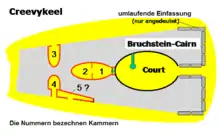 Evidence of large corbel slabs used for roofing the structure survives in the inner chamber. In the west end of cairn three subsidiary chambers were built into the body of the monument, which have been described as being small passage-graves.[7] However they seem to date from a later neolithic addition to the original monument.[2]