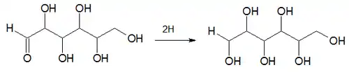The Creighton process involves the hydrogenation of a 6 carbon chain aldehyde.[1][2] The reactant is 2,3,4,5,6-pentahydroxyhexanal (an aldehyde) and the product is 1,2,3,4,5,6-hexanehexol (an alcohol). The product thus has two more hydrogen atoms than the reactant: -CHO is replaced by -CH2OH.