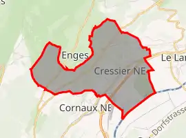 The municipality was located in the Neuchâtel district until the district level was eliminated on 1 January 2018.[5] It is at the foot of the Jura Mountains and near the, flood-prone, Thielle river. It consists of the village of Cressier and the hamlet of Frochaux.