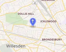 The area around the church was owned by All Souls College, Oxford and in 1900, housing was built along Anson Road.[2] By 1904 there were 210 houses in the area and another 65 were being built.[3] The influx of people and the number of houses being built began to give Cricklewood an identity as a residential district and it was during this time that several churches were built. A Congregationalist church opened on Chichele Road in 1893, St Gabriels, Cricklewood Anglican church opened on Walm Lane in 1898 and St. Michael's Anglican church opened on St Michael's Road in 1910.[4] Cricklewood Baptist Church celebrated its centenary in November 2008 with a visit from local Liberal Democrat MP, Sarah Teather.