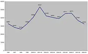Knife-enabled crime figures are available from 2003 to 2007 and more recently monthly knife crime summaries are provided on the Metropolitan Police website showing financial year to date figures.[47] Knife enabled offences increased from 2003 to 2004 and from then on saw annual reductions until 2007. It was not possible to retrieve statistics for 2008 and 2009.