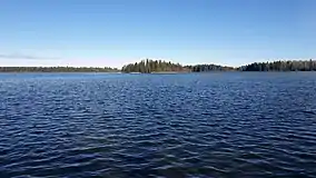 Crimson Lake received its name from the striking colours of the setting sun reflecting on the surface of its waters seen by an earlier trapper.[1] It is a small, clear, shallow lake set in the meeting spot of foothills pine forests, aspen parkland, bog and muskeg ecosystems.[2] Located on the northeast shore of the lake is Pioneer Ranch Camp, a Christian summer camp within the park's boundaries.[1]