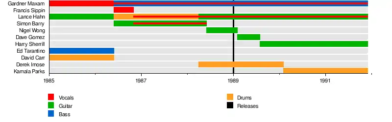 In 1989, Hahn, Maxam, and Imose moved to San Francisco and were joined by second guitarist Harry Sherrill. This lineup released the Karin 7" on Lookout! Records. Imose was later replaced by drummer Kamala Parks, co-founder of 924 Gilman Street and later of the bands Naked Aggression, Hers Never Existed, and The Gr'ups.[4] This lineup released several 7" singles and toured extensively, including stints with Green Day, Neurosis, and Thatcher on Acid.