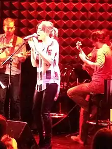 Milioti's first acting roles were bit parts in national advertising campaign ads, notably one for the Ford Edge.[7] She also appeared in television programs such as The Sopranos and films such as Greetings from the Shore. Milioti is also known for her stage performances. In 2007, she appeared on Broadway as Alice Ashbrook in Helen Edmundson's award-winning adaptation of Jamila Gavin's novel Coram Boy.[8] She was the 2010 star of That Face,[9] receiving a Lucille Lortel Award nomination for Outstanding Lead Actress for her work in Stunning.[10] In 2012, she received a Tony Award nomination for Best Actress in a Musical for her work in Once, a play in which she had performed from 2011 to 2013.[11] Her Once performance, with fellow principal soloist Steve Kazee, earned the 2013 Grammy Award for Best Musical Theater Album. She also read aloud a short story for the 2011 This American Life episode "Adventure".[12] In 2012, she appeared on several songs of Glen Hansard's debut album Rhythm and Repose.