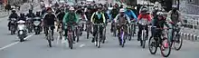 The Critical Mass rides have inspired a number of other bicycle movements, that range from political movements to the "Critical Tits" ride during the yearly Burning Man festival.[22] In Chicago, a movement has grown out of the Critical Mass community to promote winter cycling via the bikewinter campaign.[23] The extensive news coverage of San Francisco's July 1997 ride spawned an international celebration of bicycling, called Bike Summer.[24] Kidical Mass originated in Oregon, and encourages bicycle riding for children and families.[25] The movement gained momentum in North America and Europe and set a record in September 2019, when 1100 riders took part in Dortmund, Germany.[26] Critical Sass was an all-female version of the ride in Baton Rouge, Louisiana, that took place the second Friday of every month. The Tweed Run (along with various other vintage bike rides) is a well dressed mass which takes place annually in a number of cities across the world. Examples of Critical Mass rides for political movements includes the Free Tibet Rides (May 2008): Free Tibet Critical Mass in Columbia, Missouri, "Tibetan Freedom Bike Rally" in San Francisco (Aug 2008), and in "Bike Ride for Tibet" in London (Aug 2008).[27]