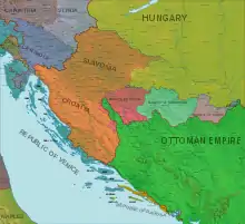 The Kingdom of Croatia (Latin: Regnum Croatiae; Croatian: Kraljevina Hrvatska, Hrvatsko kraljevstvo, Hrvatska zemlja) entered a personal union with the Kingdom of Hungary in 1102, after a period of rule of kings from the Trpimirović and Svetoslavić dynasties and a succession crisis following the death of king Demetrius Zvonimir.[1][2] With the coronation of King Coloman of Hungary as "King of Croatia and Dalmatia" in 1102 in Biograd, the realm passed to the Árpád dynasty until 1301, when the (male) line of the dynasty died out. Then, kings from the Capetian House of Anjou, who were also cognatic descendants of the Árpád kings, ruled the kingdoms. Later centuries were characterized by conflicts with the Mongols, who sacked Zagreb in 1242, competition with Venice for control over Dalmatian coastal cities, and internal warfare among Croatian nobility. Various individuals emerged during the period, such as Paul I Šubić of Bribir, who was representing the most powerful Croatian dynasty at the time, the Šubić noble family. These powerful individuals were on occasion able to de facto secure great deal of independence for their fiefdoms. The Ottoman incursion into Europe in the 16th century significantly reduced Croatian territories and left the country weak and divided. After the death of Louis II in 1526 during the Battle of Mohács and a brief period of dynastic dispute, both crowns passed to the Austrian House of Habsburg, and the realms became part of the Habsburg monarchy.