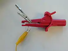 A crocodile clip (also alligator clip[1]) is a sprung metal clip with long, serrated jaws which is used for creating a temporary electrical connection. This simple mechanical device gets its name from the resemblance of its jaws to those of an alligator or crocodile. It is used to connect an electrical cable to a battery or some other component. Functioning much like a spring-loaded clothespin, the clip's tapered, serrated jaws are forced together by a spring to grip an object. When manufactured for electronics testing and evaluation, one jaw of the clip is typically permanently crimped or soldered to a wire, or is bent to form the inner tubular contact of a ~4 mm (0.16 in) female banana jack, enabling quick non-permanent connection between a circuit under test and laboratory equipment or to another electrical circuit. The clip is typically covered by a plastic shroud or "boot" to prevent accidental short-circuits.