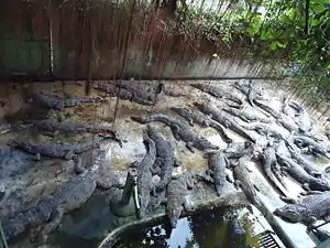 There are three smaller farms, including one combined ostrich/croc facility, where crocodiles reared number in the low hundreds.[4][10] Then there are two pig farm turned crocodile "tourist centers" in Davao (without Philippine government accreditation).[9]