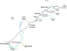 The section from Croesor Junction to the slate quarries will probably never re-open as the quarries have long since closed. However the part of the Croesor tramway that ran from Croesor Junction to Porthmadog has been rebuilt as part of the resurrection of the Welsh Highland Railway from Caernarfon to Porthmadog. The section between Croesor Junction and Pont Croesor opened in May 2010. The section from Pont Croesor to Porthmadog reopened on 8 January 2011,[2] whereby it linked up with the Ffestiniog Railway to allow through trains to Blaenau Ffestiniog railway station via the Porthmadog cross town link.