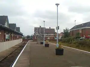 To cater to the heavy leisure traffic at the end of the 19th century, Cromer Beach had a large station building in a half-timbered style, and a large goods yard. The station originally included a bar, which was closed in 1966.[1] Following the introduction of conductor-guard working, the ticket facilities were no longer needed and the building fell into disuse; it was renovated and reopened as a public house in 1998.[2] A large supermarket was built on the site of the goods yards in 1991.[3]