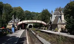 Originally known as Cromford Bridge, it was opened by the Manchester, Buxton, Matlock and Midlands Junction Railway in 1849.[3] This is one of the few stations on the line that has been preserved and is a Grade 2 listed building. It is said to have been designed by G.H.Stokes, son-in-law of Joseph Paxton. It is believed that Stokes also designed Station House (built in 1855), the extremely ornate former Station Master's residence opposite the station on the side of the hill as well as the ornate villa style waiting room, on what was the 'up' platform. According to English Heritage,[4] this is the original station building. The present station building on the opposite (down) platform was added by the Midland Railway at a later date