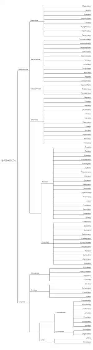 Cronquist's system places flowering plants into two broad classes, Magnoliopsida (dicotyledons) and Liliopsida (monocotyledons). Within these classes, related orders are grouped into subclasses. While the scheme was widely used, in either the original form or in adapted versions, many botanists now use the Angiosperm Phylogeny Group classification for the orders and families of flowering plants, first developed in 1998. The system as laid out in Cronquist's An Integrated System of Classification of Flowering Plants (1981) counts 64 orders and 321 families in class Magnoliopsida and 19 orders and 65 families in class Liliopsida.