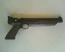 The Crosman model 1377 (also known as the "American Classic") is a single-shot, bolt-action, pneumatic .177 caliber pellet gun, featuring a rifled steel barrel and imitation wood checkered plastic grips. The 1377 was introduced in 1977, and has been in continuous production ever since. A separately available shoulder stock (which Crosman designates model 1399) converts the rather long pistol into a carbine. The 1377 is not a competition level target airgun, but its long rifled barrel makes it fairly accurate.
