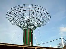 - A metal lattice funnel (or "extended conical section") radiating above and outward from and connected to the top of the cylinder.