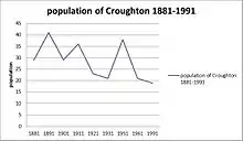 Although the population of Croughton has changed every year of the census, the population has always remained small, giving it a hamlet status. The first recorded census data for Croughton was recorded in 1881, and shows a total population of 29.[10] The graph on the right shows the differences in data. There is no data for 1941 as there was no census recorded during World War II, and data from 1961 to 1991 is unclear. There is no steady pattern in population change.