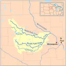 The Crow River is a tributary of the Mississippi River in south-central Minnesota in the United States. It drains a watershed of 2,756 square miles (7,140 km2).[2]