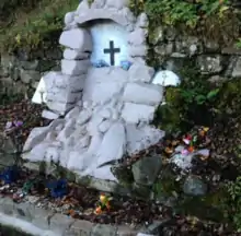 A notable feature of the village is the Croy Shrine located in the Nethercroy area to the north-east. The Shrine was built around a natural spring in the mid 1970s by local residents and featured a statue of The Virgin Mary in a grotto scene with a stone channel in front to allow access to the spring water.[17] The Shrine fell into a state of disrepair over the years due to neglect and vandalism. In 2013 some local residents rebuilt it and a rededication ceremony was held in 2014.