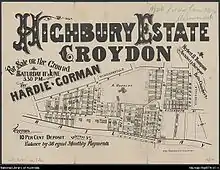 By 1820 a large part of the area had been subsumed by Joseph Underwood's large 'Ashfield Park Estate'. This property remained largely intact for more than 40 years, until it was subdivided into large blocks after the death of Elizabeth Underwood in 1858. By this time its proximity to the railway made it a desirable area (the station was originally called Fivedock).[9] One of these subdivisions was the 'Highbury Estate', on part of which Anthony Hordern, son of the founder of the great retail firm, Anthony Hordern & Sons, eventually built his house 'Shubra Hall', just beyond the west border of Ashfield. It later became part of the Presbyterian Ladies' College, the current boundaries of which give an idea of the extent of the Hordern property.[8] The College, including Shubra Hall, the main school building and the Meta Street entrance gates, is now listed on the Register of the National Estate.[10]