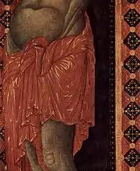 It is closely modeled on the crucifix by Giunta Pisano, now in the Basilica of San Domenico, Bologna.[5] This is most especially seen in the contortions and body type of Christ, the drapery, the architecture of the cross beams, the patterned borders and the figures of Mary and John the Evangelist at either end of the vertical cross beams. However, Cimabue goes further, especially in its portrayal of Christ's agony invoked by the contortions of his body. This is evident in that his body leans far more towards the viewer's left, and that his loincloth obscures a greater part of the patterned border alongside the crossbeam.[5]