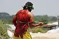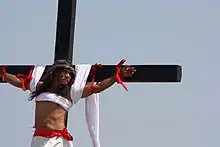 Crucifixion in the Philippines is a devotional practice held every Good Friday, and is part of the local observance of Holy Week. Devotees or penitents called magdarame in Kapampangan are willingly crucified in imitation of Jesus Christ's suffering and death, while related practices include carrying wooden crosses, crawling on rough pavement, and self-flagellation. Penitents consider these acts to be mortification of the flesh, and undertake these to ask forgiveness for sins, to fulfil a panatà (Filipino, "vow"), or to express gratitude for favours granted. In the most famous case, Ruben Enaje drives four-inch nails into both hands and feet and then he is lifted on a wooden cross for around five minutes.[1]