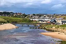Just west of Slains Castle, Cruden Bay is said to have been the site of a battle in which the Scots under King Malcolm II defeated the Danes in 1012.[2] Traditionally, the name was derived from the Gaelic Croch Dain (Slaughter of Danes).[3]
