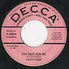 On February 23, 1957, "Cry Not for Me" was released as a seven inch single on Decca Records. It was backed by "Yes I Understand" on the B-side.[5] The single was not commercially successful. Four Star's chief label head, Bill McCall, heard that Cline was disappointed and was looking for alternative record labels. In an effort to cover himself, McCall arranged for Cline to return to the studio and record two demo sessions for Four Star. Cline also promoted the single on a televised performance of Ozark Jubilee and guest-starred on the Grand Ole Opry.[4] The song received a positive response from AllMusic, who called the track an example of "torchy pop".[1]