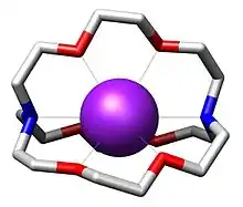 Cryptands are a family of synthetic bicyclic and polycyclic multidentate ligands for a variety of cations.[2] The Nobel Prize for Chemistry in 1987 was given to Donald J. Cram, Jean-Marie Lehn, and Charles J. Pedersen for their efforts in discovering and determining uses of cryptands and crown ethers, thus launching the now flourishing field of supramolecular chemistry.[3] The term cryptand implies that this ligand binds substrates in a crypt, interring the guest as in a burial. These molecules are three-dimensional analogues of crown ethers but are more selective and strong as complexes for the guest ions. The resulting complexes are lipophilic.[4]