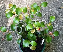 The leaves are veiny, ovate and attractive, between 1.5 and 4 cm in diameter. Faintly scented white flowers form between October and January. A black drupe forms in late summer and early autumn. Germination from fresh seed is slow but reliable.