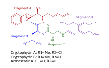 Cryptophycins were originally discovered in 1990 in cyanobacteria of the genus Nostoc.[1] Cryptophycins were patented as antifungal agents with an unknown mechanism of action and subsequently identified as microtubule inhibitors.[2] Closely related molecules were reported in the marine sponge Dysidea arenaria, which were first given the name arenastatins.[3] However, since cyanobacteria are common symbionts of sponges, it has been suggested that bacteria may be the true origin in cases where sponge and bacterial metabolites closely resemble one another.[4] Nevertheless, study of the structure-activity relationships between the two subgroups of molecules led to improved understanding of their cytotoxic effects.[5]: 230