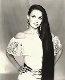 Gayle's image has garnered her significant media attention. Notably, she is known for her floor-length hair.[4] As a child, Gayle's mother kept her hair short. She was inspired to grow her hair to her knees after seeing a woman with similar hair in Nashville.[96] When her hair increased in length by the late 1970s, Gayle's fan club also significantly increased.[92] By the early 1990s, her hair had reached floor's length. During that time, she considered significantly cutting her hair due to headaches and time spent maintaining it.[4] However, she ultimately decided not to cut it. Gayle credits her daughter for discouraging a haircut. Gayle's daughter told her, "You can't cut your hair — you won't be Crystal Gayle."[100] Gayle also stated that it is easier to have long straight hair, "I know some people think: 'Why does she keep it so long?' I'd probably love to try all the different styles, but I'm not a beautician. So, I keep it long. It's easy to wash and let it go."[101] However, according to Gayle, she still continues seeing a hairstylist. Within a year, she cuts 9 to 12 inches of hair.[94]