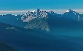 ![]() North aspect of Crystal Peak centered, as viewed from Hurricane Ridge. (Chimney Peak to right) | |