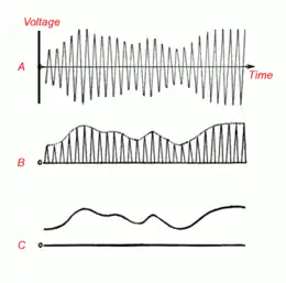 How the crystal detector works. [84][85] (A) The amplitude modulated radio signal from the tuned circuit. The rapid oscillations are the radio frequency carrier wave. The audio signal (the sound) is contained in the slow variations (modulation) of the amplitude (hence the term amplitude modulation, AM) of the waves. This signal cannot be converted to sound by the earphone, because the audio excursions are the same on both sides of the axis, averaging out to zero, which would result in no net motion of the earphone's diaphragm. (B) The crystal conducts current better in one direction than the other, producing a signal whose amplitude does not average to zero but varies with the audio signal. (C) A bypass capacitor is used to remove the radio frequency carrier pulses, leaving the audio signal