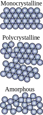 Polycrystalline silicon is composed of many smaller silicon grains of varied crystallographic orientation, typically >1 mm in size. This material can be synthesized easily by allowing liquid silicon to cool using a seed crystal of the desired crystal structure. Additionally, other methods for forming smaller-grained polycrystalline silicon (poly-Si) exist such as high temperature chemical vapor deposition (CVD).