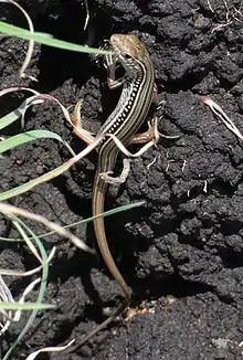 The Eastern Striped Skink is a wary diurnal skink that typically inhabits mostly open areas with the option of shelter in grass, low shrubs or rocks, and will burrow under rocks or logs when seeking shelter.[3]