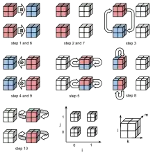 CubeHash[1] is a cryptographic hash function submitted to the NIST hash function competition by Daniel J. Bernstein. CubeHash has a 128 byte state, uses wide pipe construction, and is ARX based. Message blocks are XORed into the initial bits of a 128-byte state, which then goes through an r-round bijective transformation between blocks. The initial NIST proposal ("Cubehash8/1") required about 200 cycles per byte.[2] After clarifications from NIST, the author changed the proposal to Cubehash16/32, which "is approximately 16 times faster than CubeHash8/1, easily catching up to both SHA-256 and SHA-512 on the reference platform" while still maintaining a "comfortable security margin".[3]