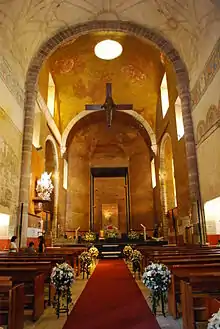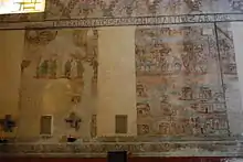 By the middle of the 20th century, the church still had some of its former rich decor, including a gilded Churrigueresque main altar, along with two side altars with columns and capitals, along with wood sculpture of the Virgin Mary. One of these capitols is important as it relates to where the celebration of the first mass in Cuernavaca.[5] However, in 1957 the Cathedral underwent another major remodeling by federal government. Some of the work consisted of restoring elements to their original condition. This included the cloister's cells, refectory, library and corridors.[4][5] Some Baroque elements were added to the bell tower.[6] But the major changes were made in the interior of the main church. The outer layers of plaster were removed, exposing mural work from the 18th century, which covers almost all of the walls of the main nave. This work tells the story of the martyrdom of Phillip of Jesus and other missionaries who were crucified in Nagasaki.[5] The Churrigueresque altars and other older elements were mostly taken out and replaced with simple modern elements, especially in the main altar area. The older decorative items were placed in a pinacotheca on the premises but are not available to the public.[4]