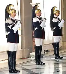 The squadron returned to the Quirinal on 11 May 1948, when the second president of Italy Luigi Einaudi restored the "Squadron of Carabineer Guards" (Squadrone Carabinieri Guardie) with the historical uniforms of 1876.[1][7]