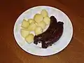 Meat dishes include cold Éisleker Ham, literally Oesling ham, from the mountainous north of the country, first marinated for a couple of weeks and then smoked for several days. It is usually served thinly sliced with chipped potatoes and salad.[5] Perhaps the most traditional of all Luxembourg meat dishes is Judd mat Gaardebounen, smoked collar of pork with broad beans. The pork is soaked overnight, then boiled with vegetables and spices. Served in copious slices together with the beans and boiled potatoes, it is considered to be the national dish of Luxembourg.[6] Hong am Rèisleck, similar to the French Coq au Riesling, consists of browned chicken pieces simmered in white wine with vegetables, spices and mushrooms.[7] Huesenziwwi or Civet de lièvre is a jugged hare dish served during the hunting season.[8]